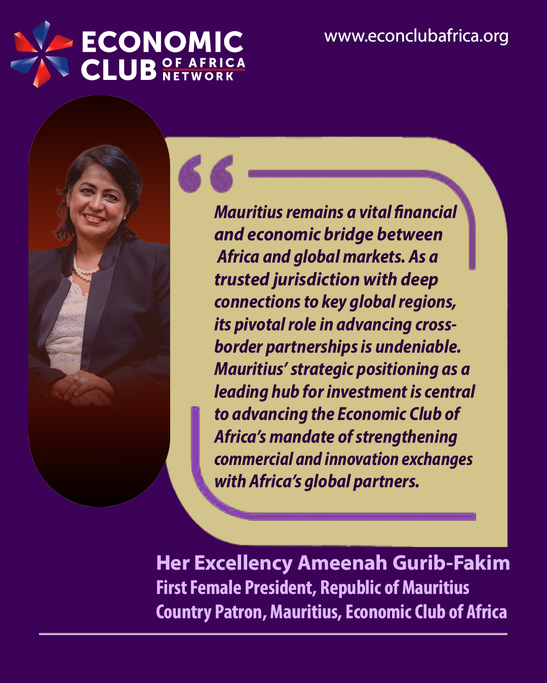 “Mauritius remains a vital financial and economic bridge between Africa and global markets. As a trusted jurisdiction with deep connections to key global regions, its pivotal role in advancing cross-border partnerships is undeniable. Mauritius’ strategic positioning as a leading hub for investment is central to advancing ECAN’s mandate of strengthening commercial and innovation exchanges with Africa’s global partners. I am honoured to serve as ECAN’s Country Patron for Mauritius,” said Her Excellency Ameenah Gurib-Fakim.
